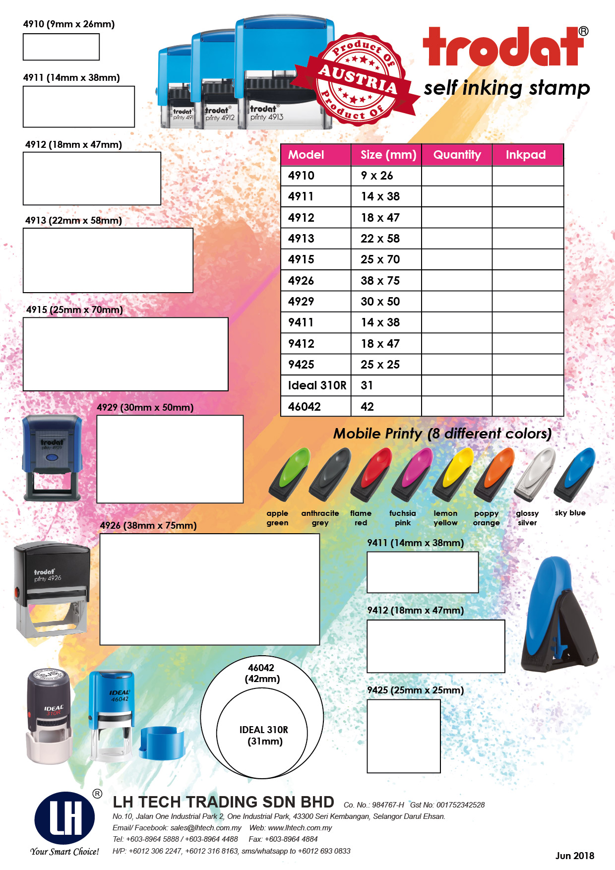 Trodat self inking holders come with various sizes suitable for different types of purpose. The most common usage is for address stamp, and corporate stamp.